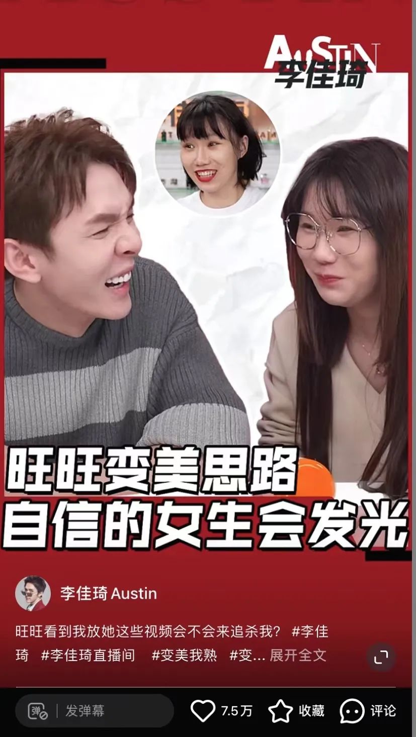 直到有一天所有人都发现这个曾经被嘲的“小老太太”变美了。去年3月,李佳琦的小红书账号发布了一个关于旺旺变美的视频:“工资高;带了牙套,五官发生了变化;头发变长了;会化妆了。”这是旺旺个人第一个出圈视频。