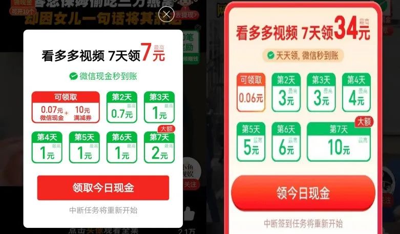 而且我们注意到,多多视频用户端现金补贴已经出现两大问题:首先,目前似乎已经收缩了现金补贴,一刻商业作为新用户在线体验时,首页显示,新人最高7天可赚取7元,但是根据网友分享,以前最高7天可赚取34元。其次,多多视频提现成为第二个“砍一刀”,提现很困难,受到不少用户吐槽。