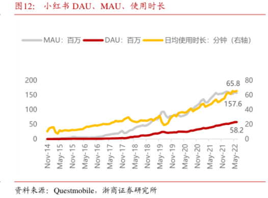 小红书DAU、MAU及使用时长,资料来源:浙商证券