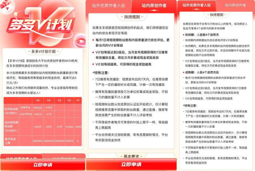为了吸引其他平台优质作者,V计划将作者申请划分为“站外优质作者”及“站内原创作者”,对于前者,成功入驻多多视频就有4个月的扶持期,而且扶持期内不会因为短视频粉丝数不达标而降级——为了吸引站外更多优质创作者,多多视频给出了极大的诚意。